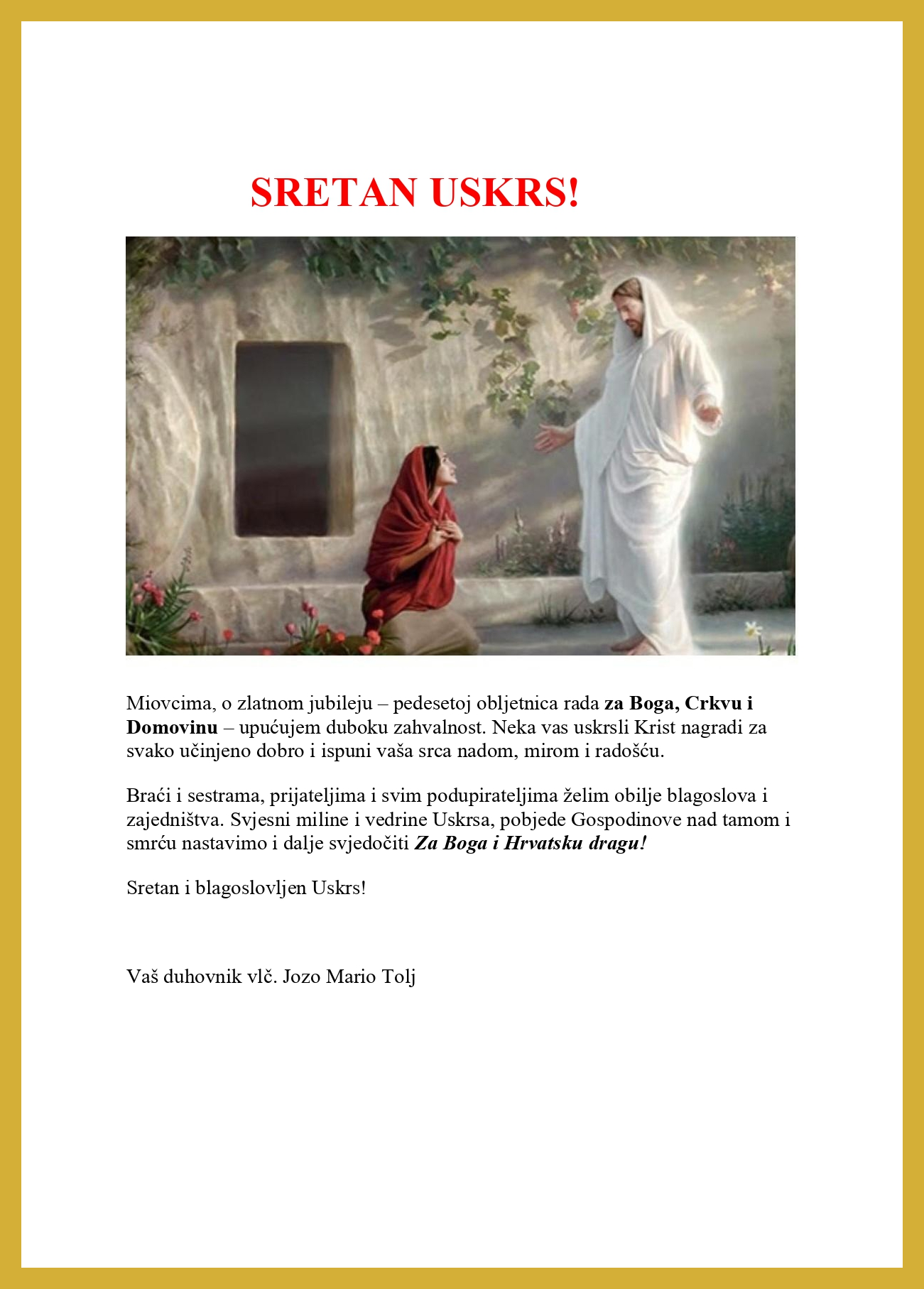 USKRSNA ČESTITKA UTEMELJITELJA I DUHOVNIKA HKZ “MI” VLČ. JOZE MARIJA TOLJA