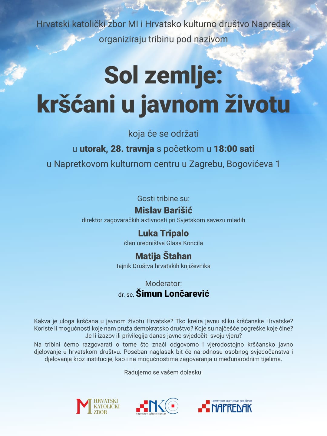 U Zagrebu je 28. travnja održana tribina pod nazivom „Sol zemlje: kršćani u javnom životu“, u organizaciji Hrvatskog katoličkog zbora MI i Hrvatskog kulturnog društva Napredak. Događaj se održao u Napretkovom kulturnom centru u Zagrebu, a okupio je brojne zainteresirane za pitanje uloge kršćana u suvremenom društvu.